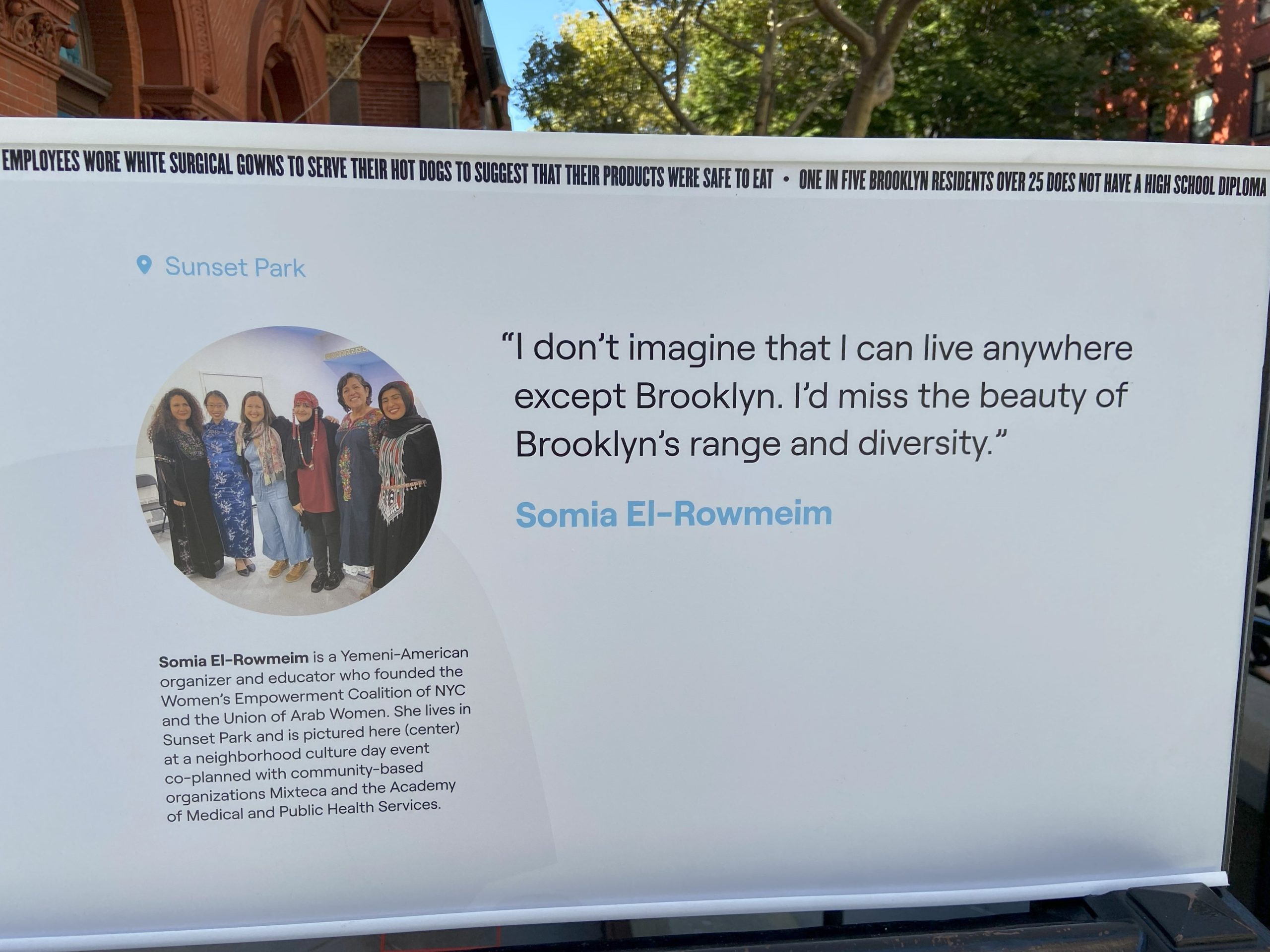 Outdoor display_Somia El-Rowmein October 31, 2023 Return to: Center for Brooklyn History: Sharing the Borough’s StoriesFull resolution (2560 × 1920) Image navigation Previous Image Next Image Quotes from residents and Brooklyn facts are part of the “Brooklyn is . . .” exhibition. This one is outside the building.