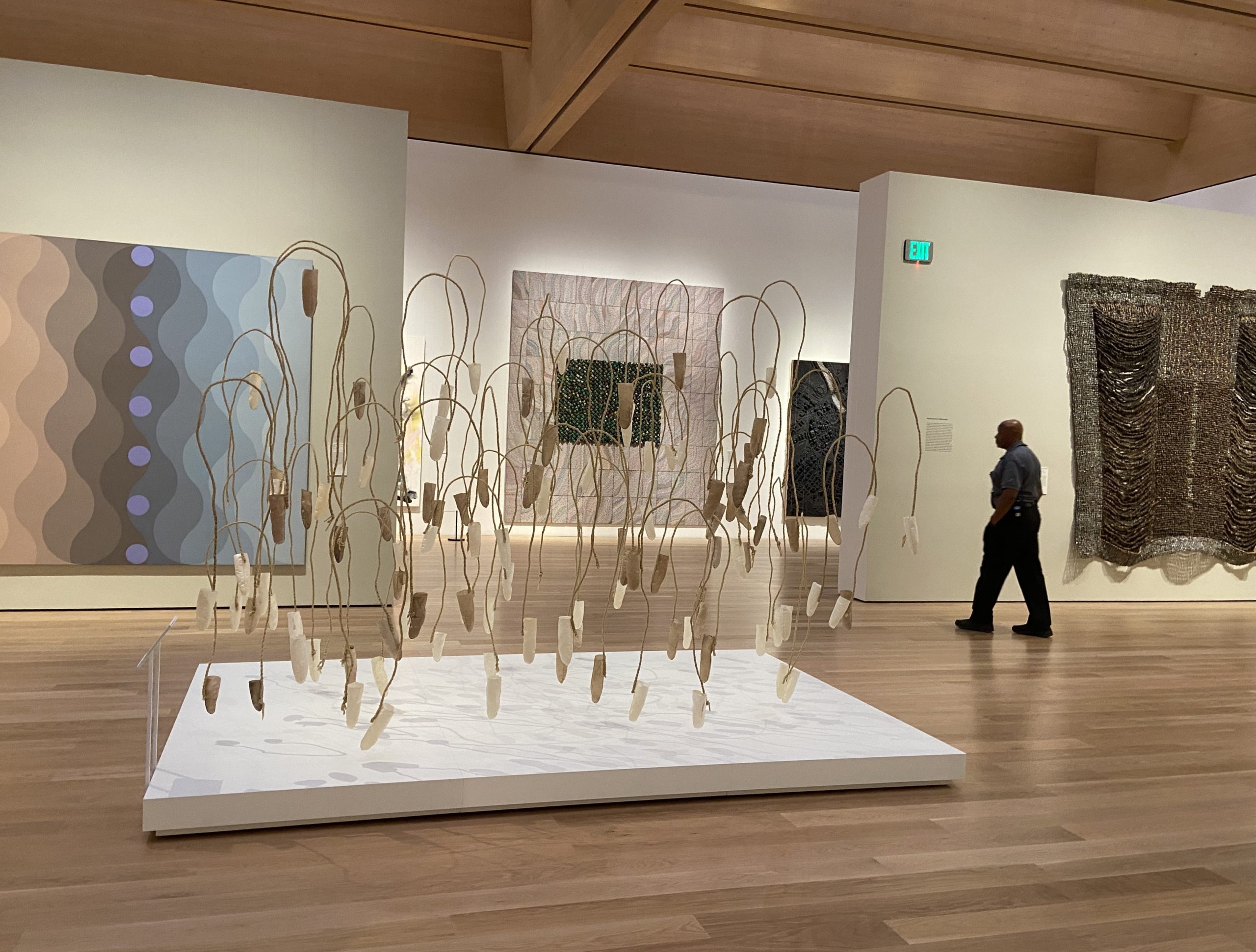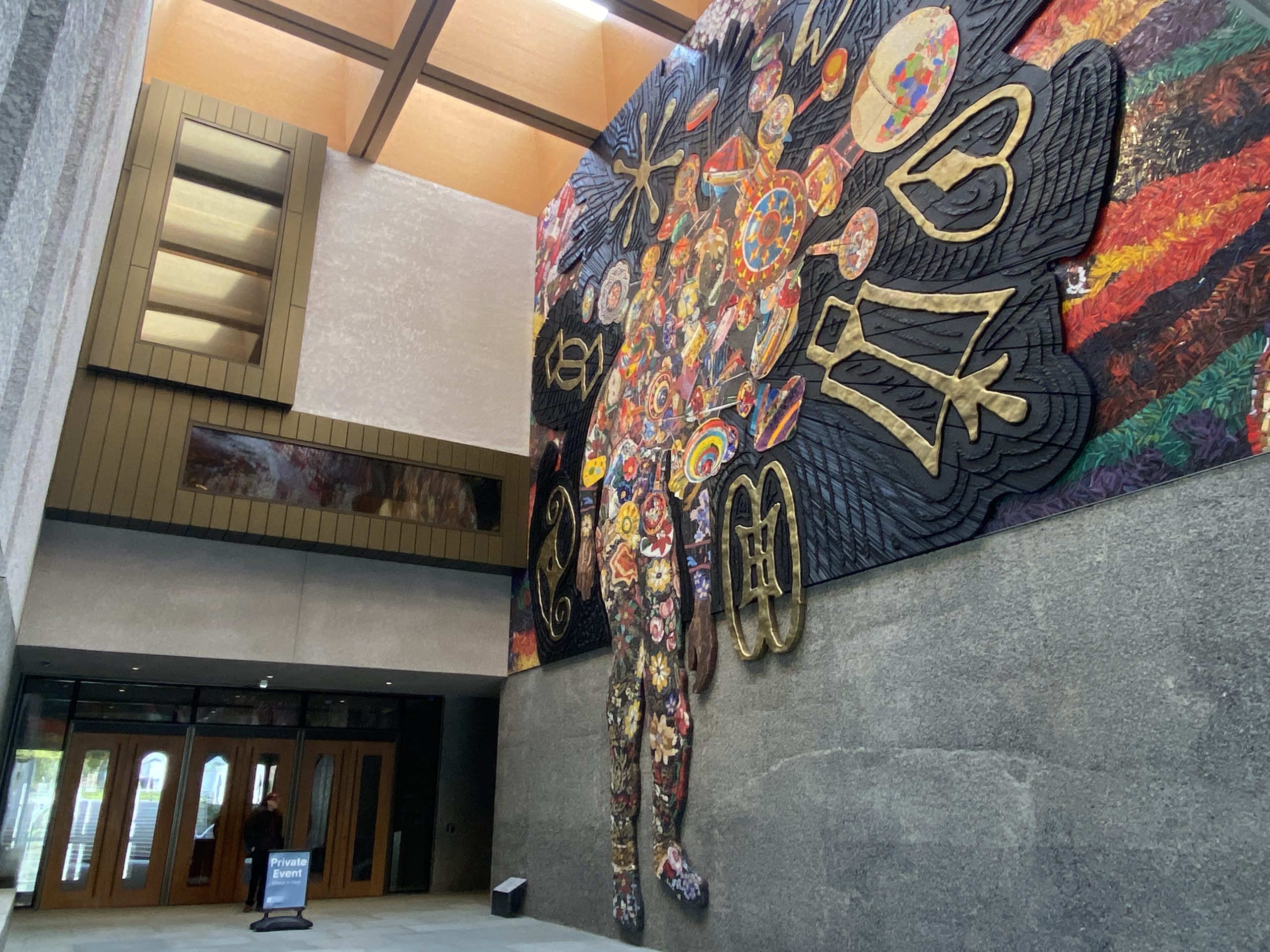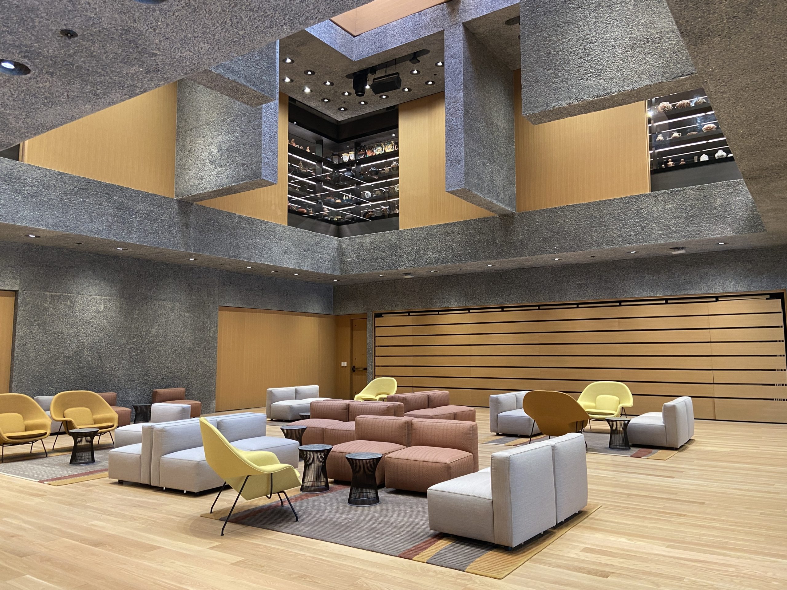 From its exterior to the spaces inside, the expansive building makes a dramatic statement among its neighbors, with stone, bronze, concrete, and glass on the facade of the three-story pavilions. At the main entrance, a covered courtyard is the site of Nick Cave’s enormous glass mosaic and wood wall relief “Let me kindly introduce myself. They call me Prince Brighton,” described by the artist as a self-portrait, with a large figure welcoming museum visitors. On the light-filled first floor, gray stone aggregate walls, terrazzo floors, and warm-hued wood provide a beautiful backdrop to spaces such as the multipurpose Grand Hall (filled with comfortable chairs during a museum preview). In the first-floor Welcome Gallery, the exhibition Toshiko Takaezu: Dialogues in Clay presents the pioneering ceramic art of Takeazu (1922–2011), who taught at Princeton. A staircase to the second floor has views of the galleries above and part of a medieval Spanish staircase on the opposite wall.