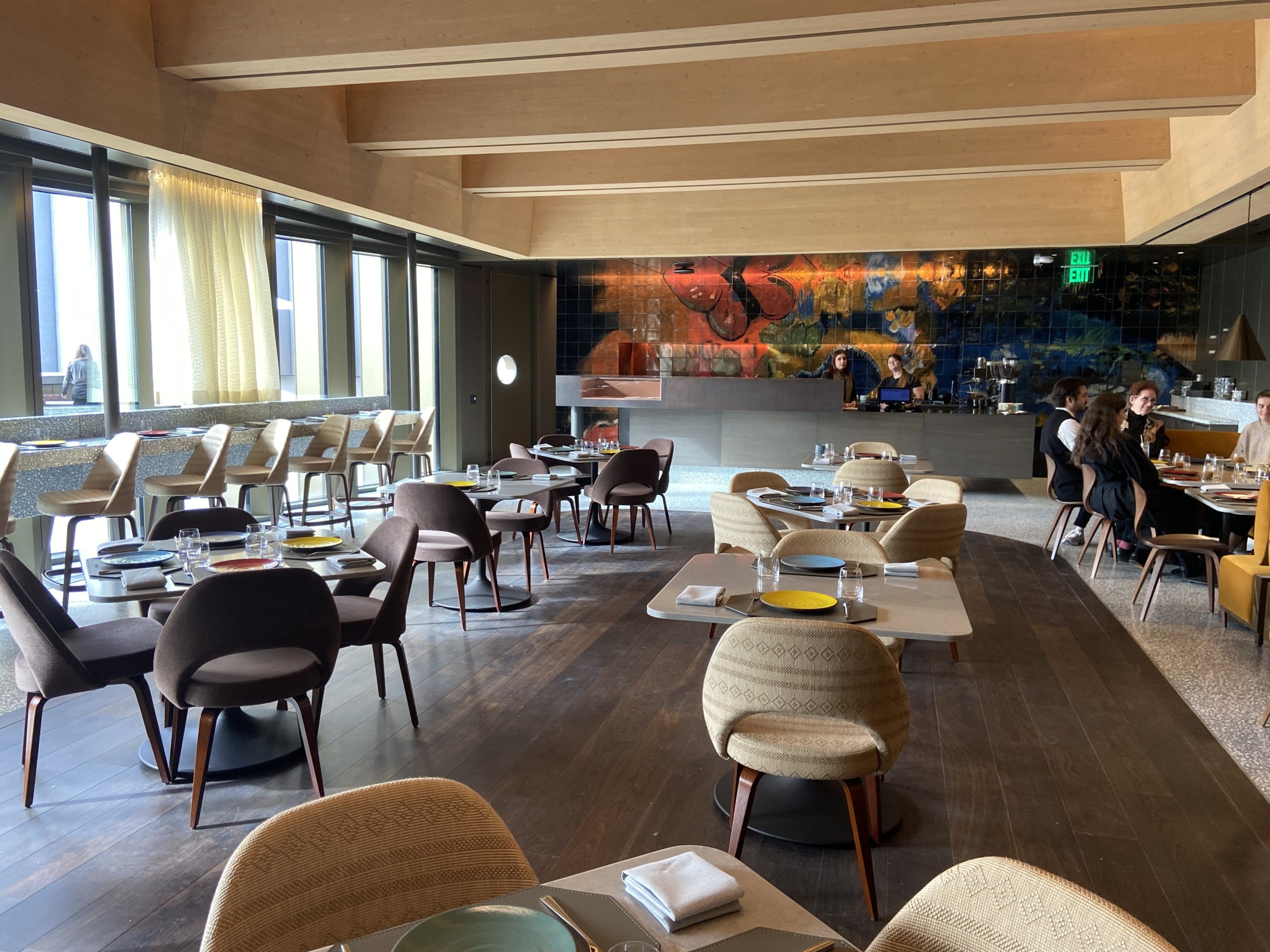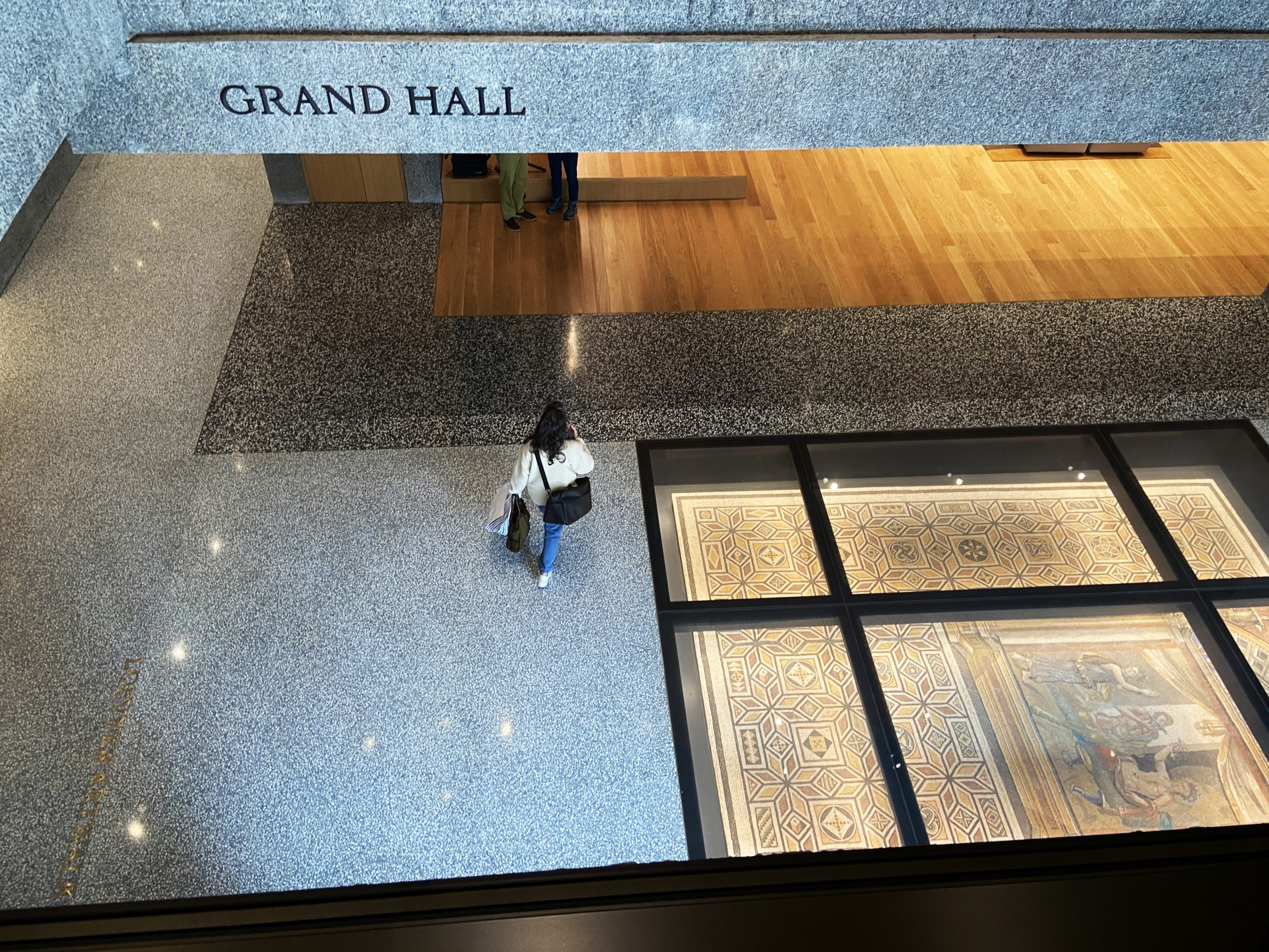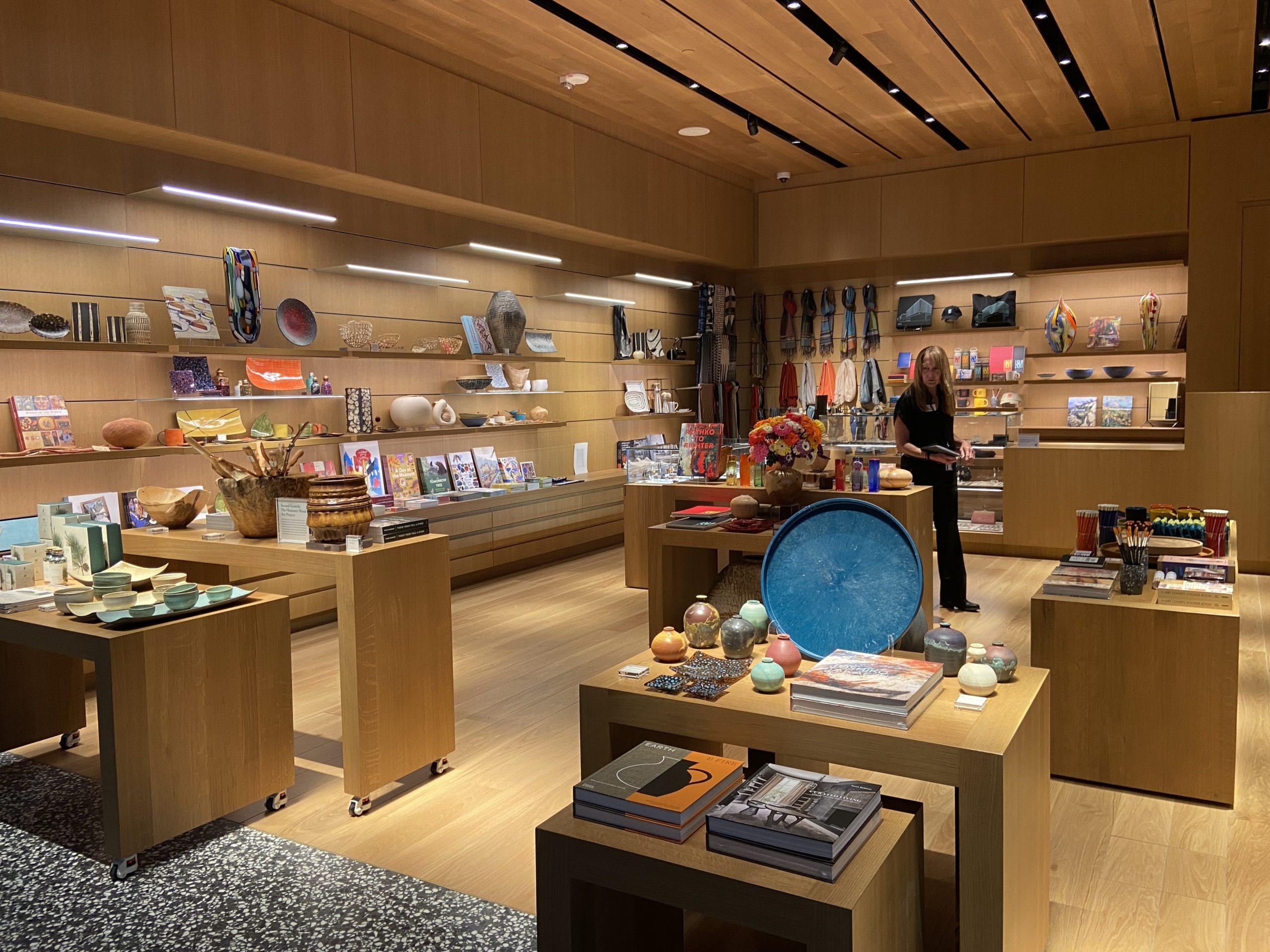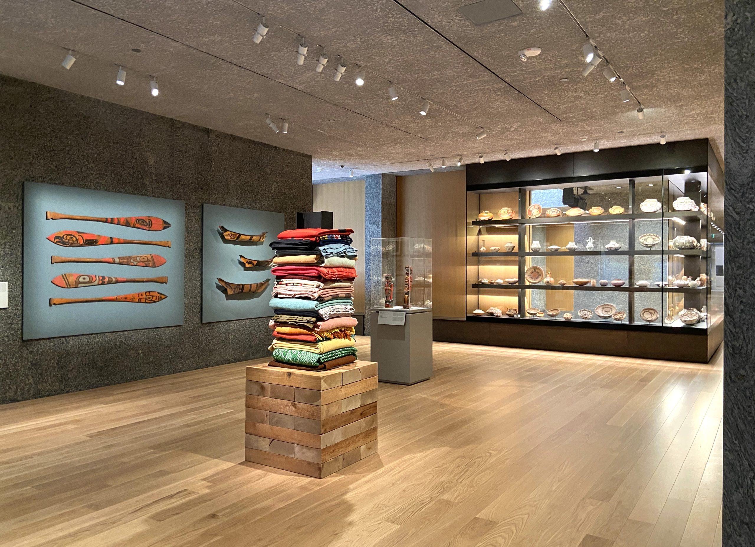 From its exterior to the spaces inside, the expansive building makes a dramatic statement among its neighbors, with stone, bronze, concrete, and glass on the facade of the three-story pavilions. At the main entrance, a covered courtyard is the site of Nick Cave’s enormous glass mosaic and wood wall relief “Let me kindly introduce myself. They call me Prince Brighton,” described by the artist as a self-portrait, with a large figure welcoming museum visitors. On the light-filled first floor, gray stone aggregate walls, terrazzo floors, and warm-hued wood provide a beautiful backdrop to spaces such as the multipurpose Grand Hall (filled with comfortable chairs during a museum preview). In the first-floor Welcome Gallery, the exhibition Toshiko Takaezu: Dialogues in Clay presents the pioneering ceramic art of Takeazu (1922–2011), who taught at Princeton. A staircase to the second floor has views of the galleries above and part of a medieval Spanish staircase on the opposite wall.