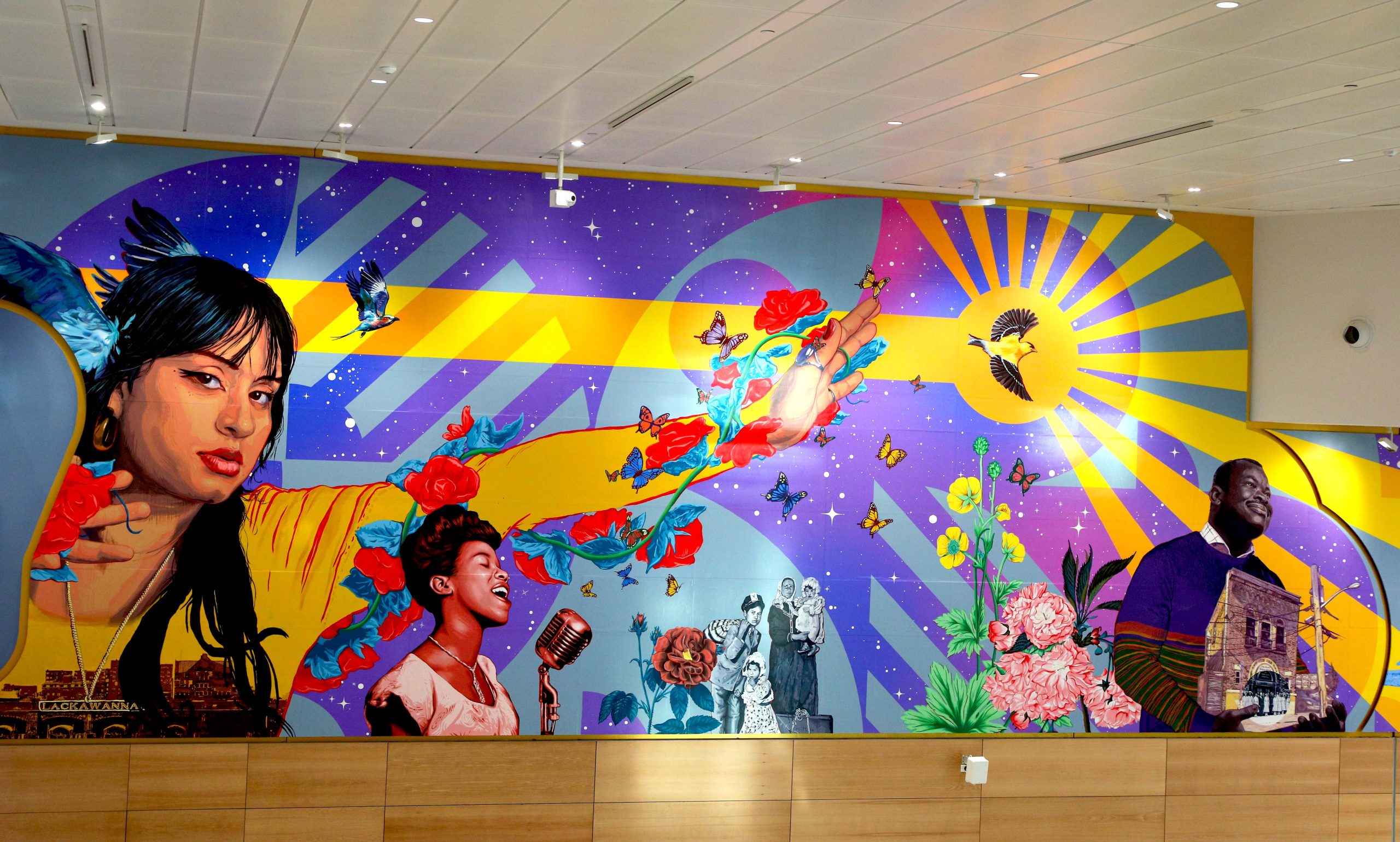 Newark Terminal A: The new Terminal A at Newark Liberty International Airport showcases New Jersey’s creativity and diversity through two major permanent artworks by Layqa Nuna Yawar and Karyn Olivier. Yawar’s 350-foot mural, Between the Future Past, displays Newark’s diverse community and natural environment, guided by his Indigenous heritage to convey time’s cycle and celebrate marginalized groups. Olivier’s twin suspended sculptures, Approach, capture Newark and Elizabeth’s architecture and topography from sunrise to nightfall, making flight a central theme. These installations are augmented by 27 rotating works from local artists, honoring the region’s heroes and landscape.