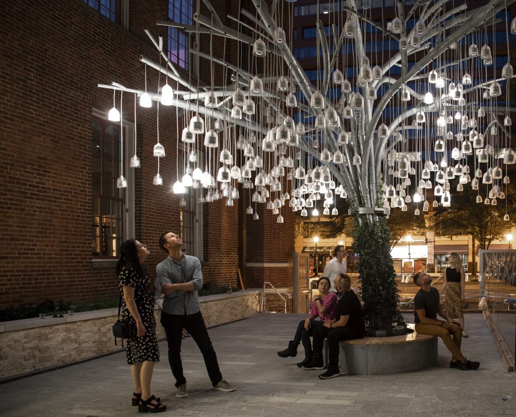 Planet Word (Washington, D.C.): The willow tree, symbolising life and growth, represents today’s linguistic diversity in Rafael Lozano-Hemmer’s interactive sculpture, Speaking Willow. Commissioned by Ann and Tom Friedman and Public Art Fund, this is Lozano-Hemmer’s first permanent outdoor piece, installed since October 2020 at Planet Word in Washington D.C. Inspired by Bell’s photophone, Speaking Willow uses light and sound, with speakers that gently sway in response to visitors. When visitors pass under its branches, speakers play recordings from over 99% of the world’s languages. Since the 1990s, Lozano-Hemmer has created participatory installations incorporating architecture, digital media, and public interaction. Side of Culture wrote about Planet Word in September 2021.