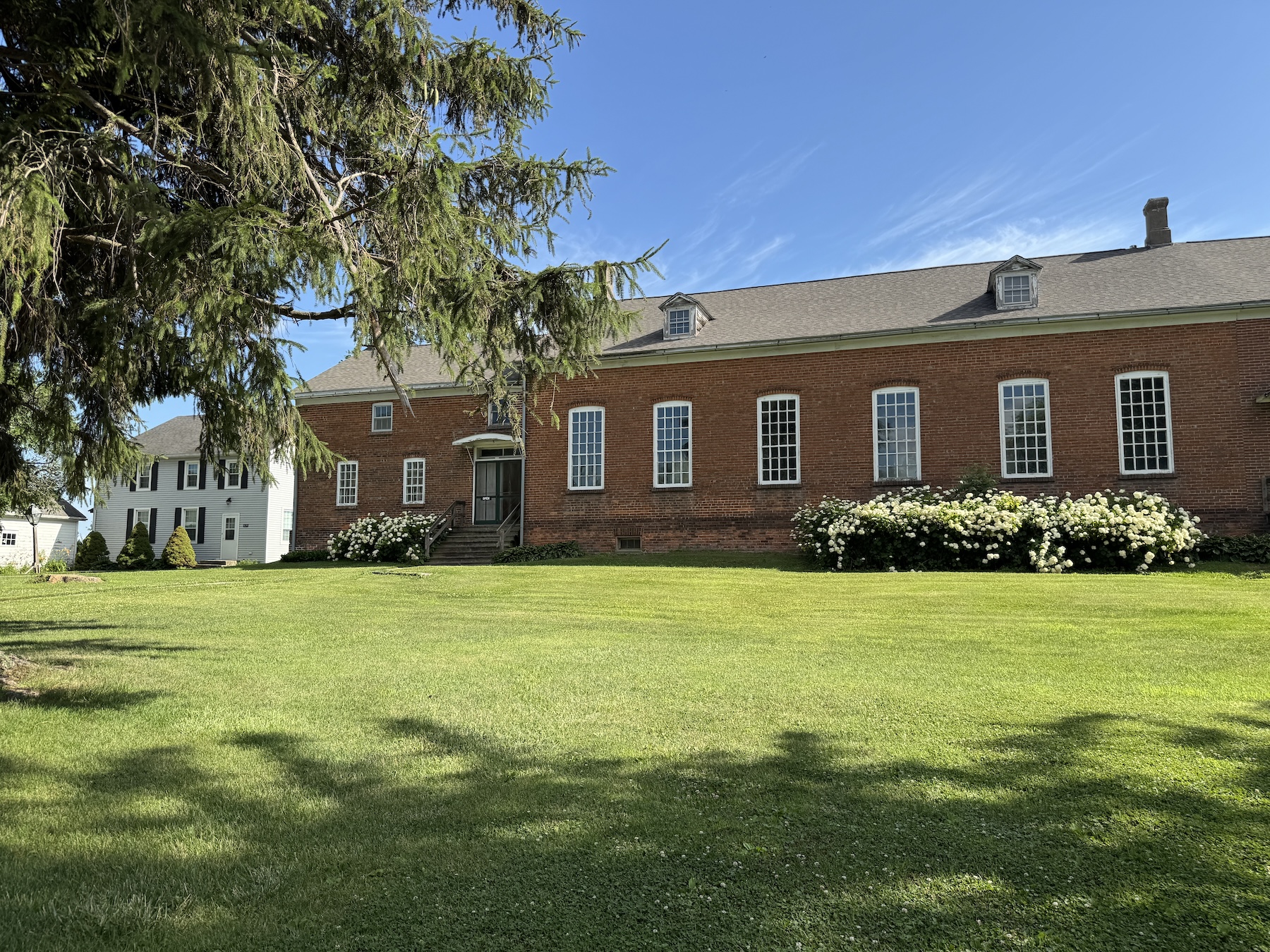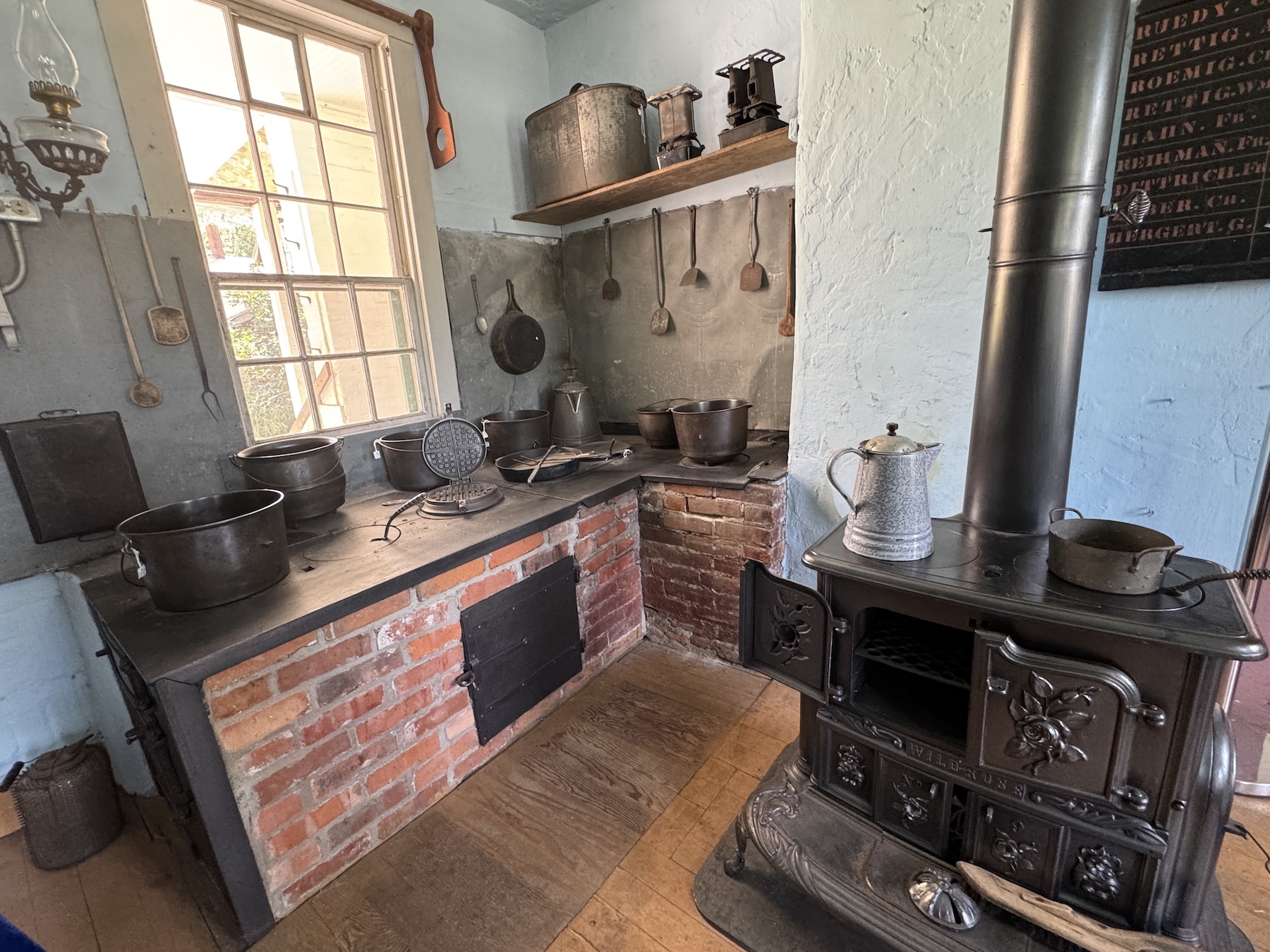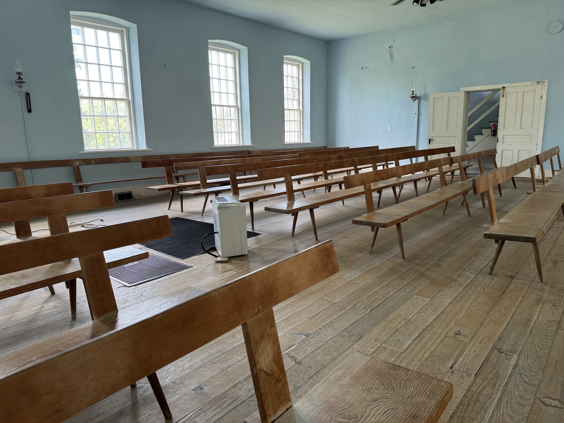 Finally, there is the evocative 1865 Homestead Church, a red brick building with a large meeting hall at its center, a starkly plain place with pine benches arranged parallel to the building’s length not width. Men and women had separate entrances and sat on opposite sides of the aisle. That’s still true in the two Radical Pietist churches that remain active, and German is still used for parts of some services.