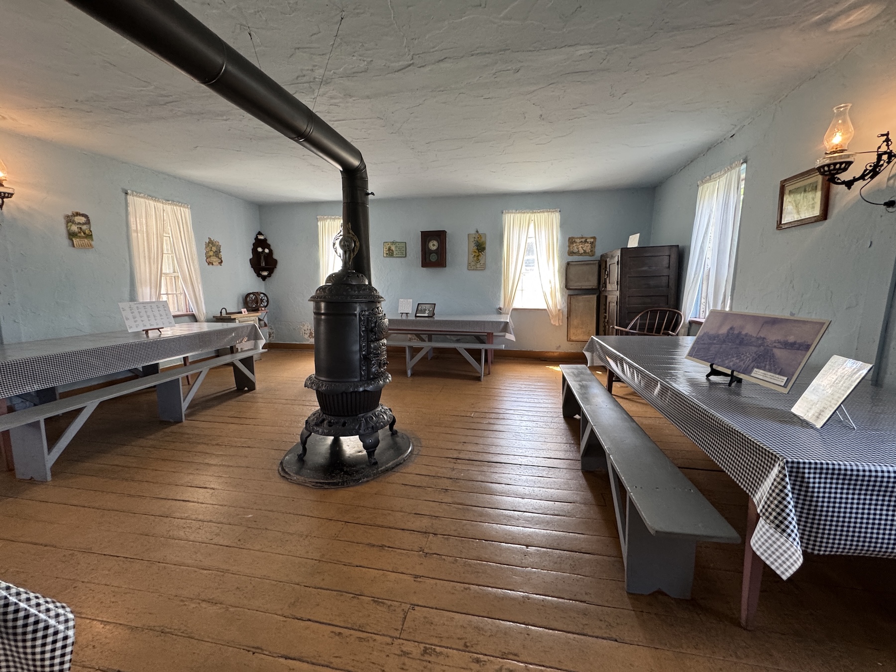 The adjacent dining area is an austere space with three tables that resemble oversized picnic tables. Visitors can see sample menus for the 33 meals Amana women would have prepared in a week.
